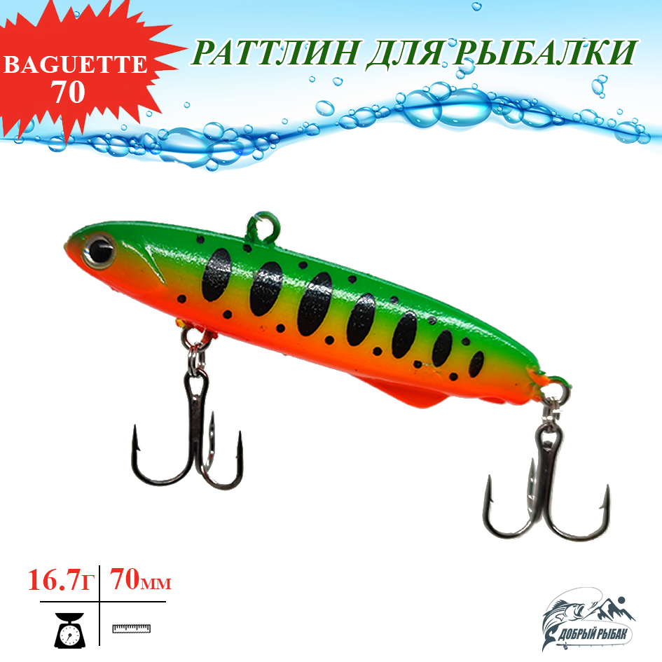 Раттлин BAGUETTE - отличительной особенностью данной приманки, является силиконовый материал, использованный в изготовлении. Приманка достаточно прочная, и не сильно повреждается хищником. Раттлин BAGUETTE обладает неповторимой и естественной игрой, близкой, по характеру, к балансирам, но с более медленным возвращением в исходную точку после взмаха. В подвешенном состоянии, держится строго горизонтально, в воде нос опускается ниже, что позволяет разнообразить игру.